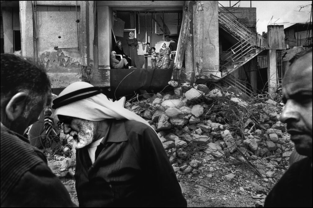 A Palestinian family in the Jenin refugee camp sits inside the rubble of their home, razed by the Israeli army during Operation Defensive Shield.